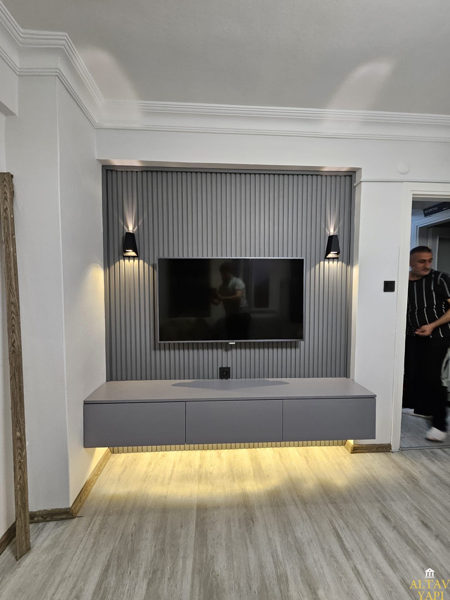 Özel televizyon ünitesi, mekâna tam uyum sağlayarak kusursuz bir görünüm sunar. Duvarla bütünleşen tasarımı sayesinde kablo karmaşasını ortadan kaldırır ve düzenli bir alan oluşturur. Aynı zamanda depolama alanları, raf sistemleri ve gizli bölmeler ile yaşam alanını daha kullanışlı hâle getirir.